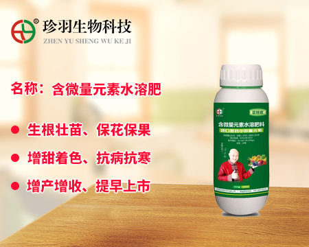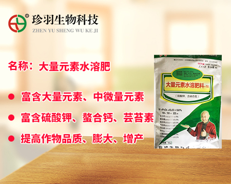 大量元素水溶肥料為經水溶解或稀釋,用于灌溉施肥、葉面施肥、無土栽培、浸種蘸根等用途的液體或固體產品,可以葉面施肥、浸種蘸根、灌溉施肥,灌溉包括噴灌、滴灌等方式進行灌溉時施肥,既節約用水,又節約施肥,而且還植物吸收快,大量元素水溶肥是一種可以完全溶于水的多元復合肥料,它能迅速地溶解于水中,更容易被作物吸收,而且其吸收利用率相對較高,我們看一下珍羽生物的大量水溶肥。
